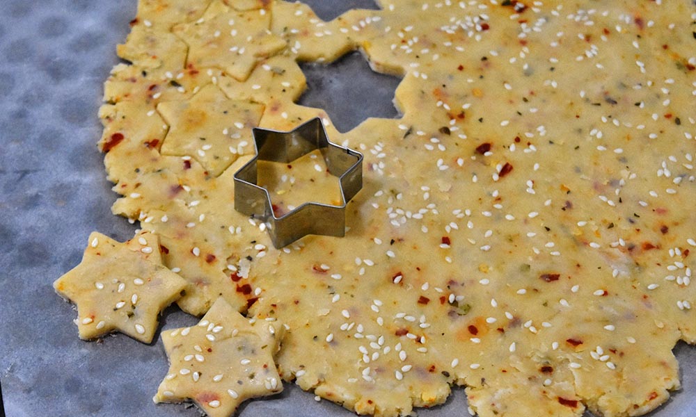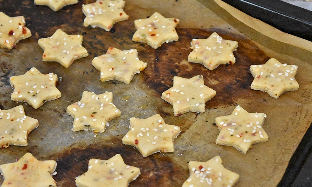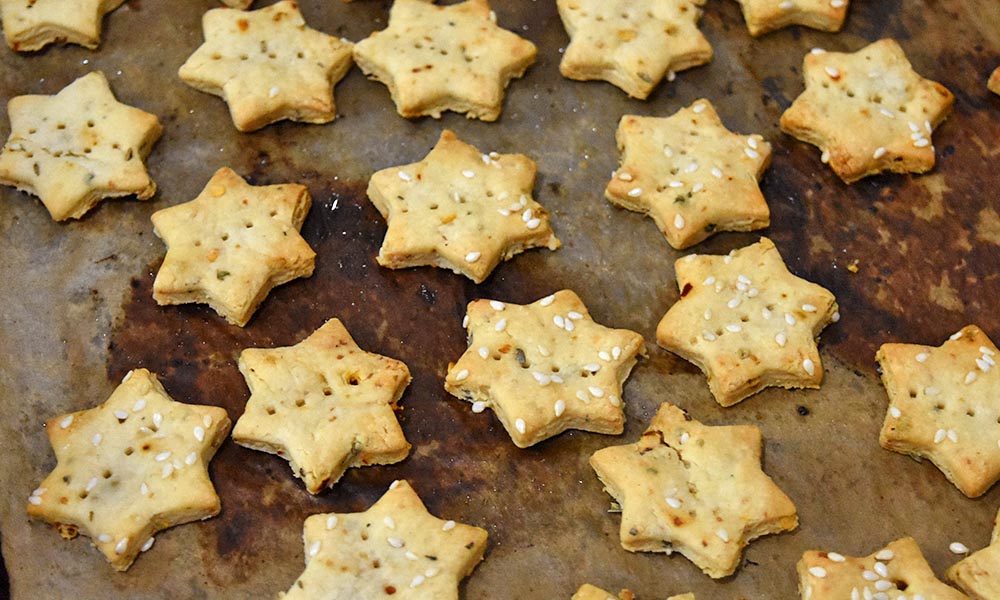 - Place all the shaped crackers on a lined baking tray and bake in a preheated oven at 160 °C for 20 min.