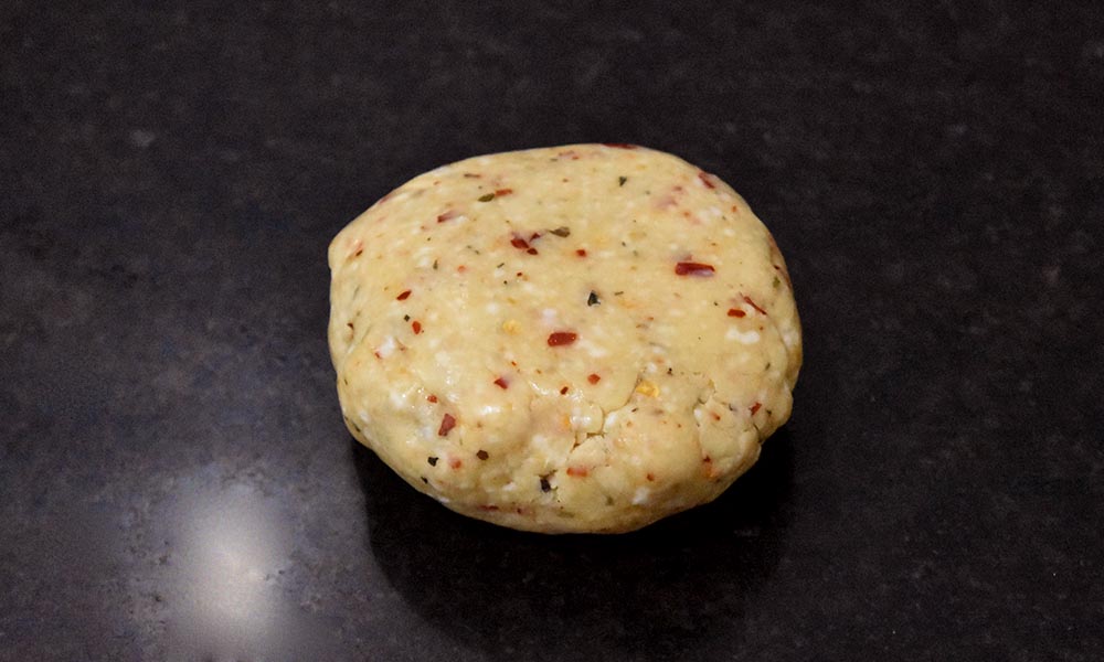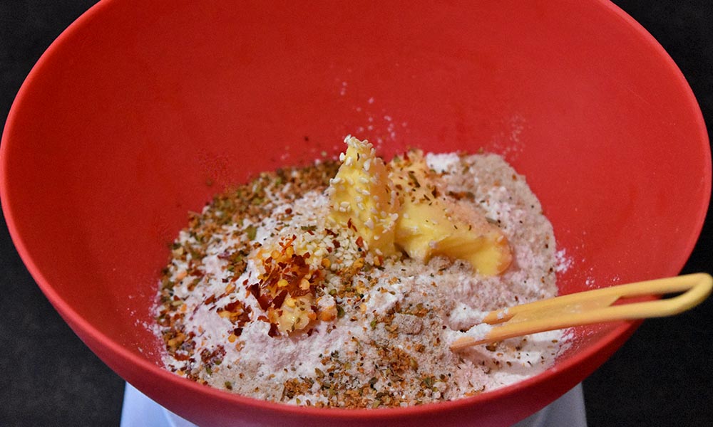 - In a bowl take sourdough discard/starter, Amaranth flour, brown sugar, salt, Chilli flakes, mixed herbs, butter, and garlic powder.