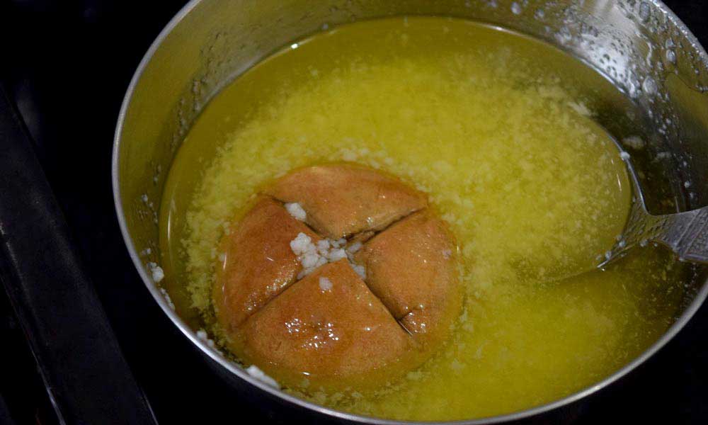 - Dip all the baked bati's in ghee and let these rests for 1-2 minutes.