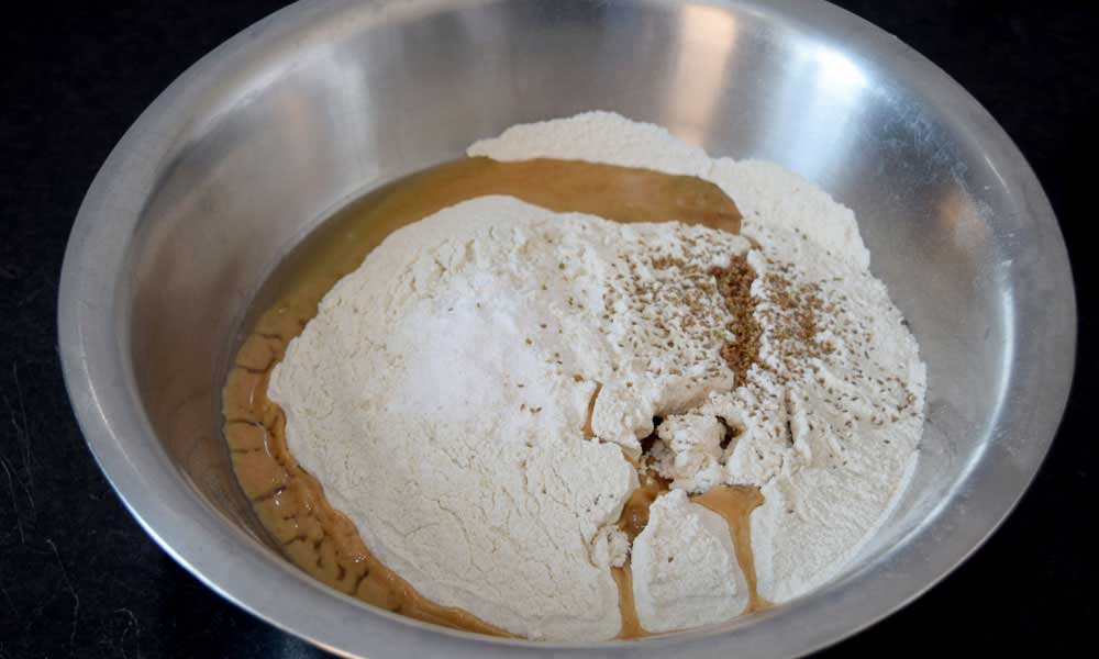- In a kneading bowl, add whole wheat flour, Semolina, salt, carom seeds and melted ghee.