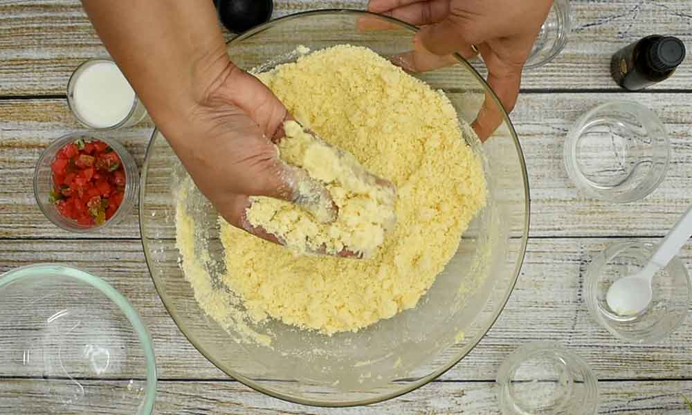 - Add ¼ tsp Karachi Biscuit flavour and 2 tbsp milk to bind the dough.