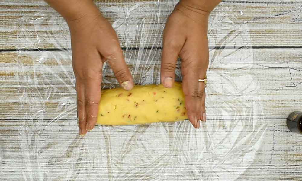 - Shape the dough into a log. Cover it with cling wrap.