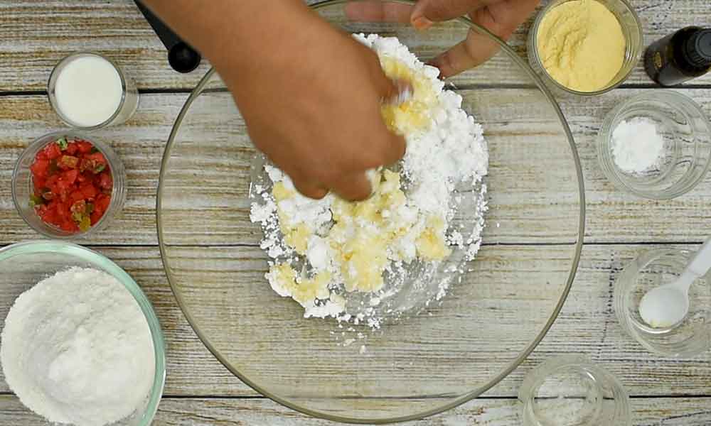 Add All-Purpose Flour, Custard Powder and Baking Powder to the whisked butter mixture. Mix everything to bind it. Do not knead it like a dough but combine everything with a soft hand until it comes together.