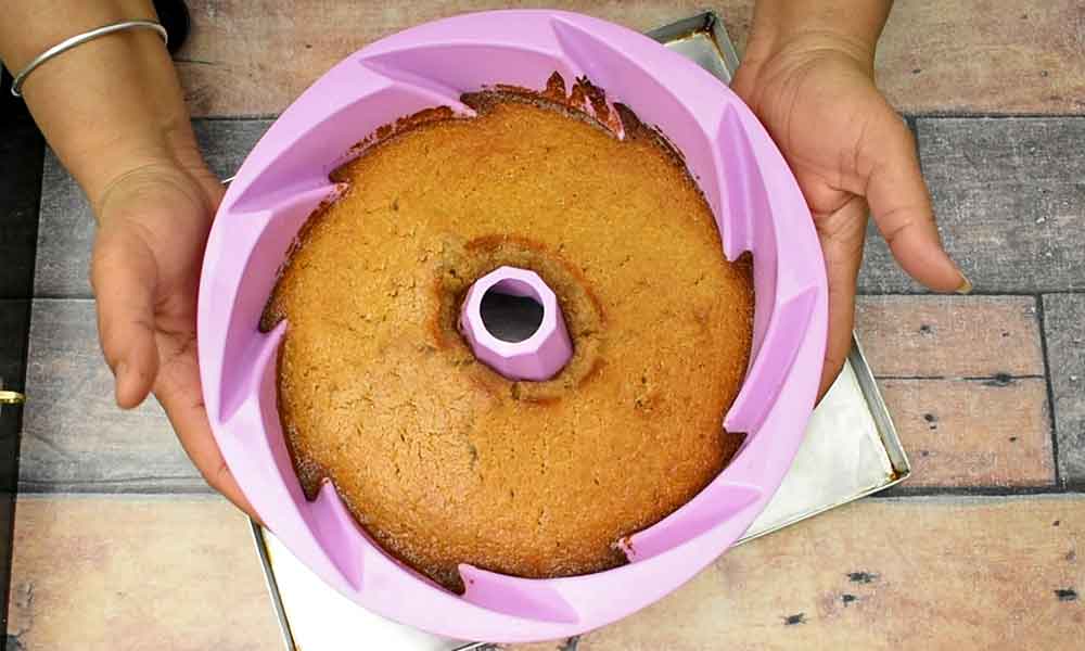 After 35 minutes, the cake is out of the oven. It has baked completely. Let the cake rest in the mold for 10 minutes. Immediate unmolding can break the cake into pieces.