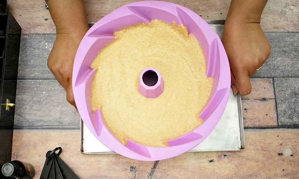 Here I am using a 23 cm silicon bundt pan. Pour the prepared batter into it and gently spread it evenly.