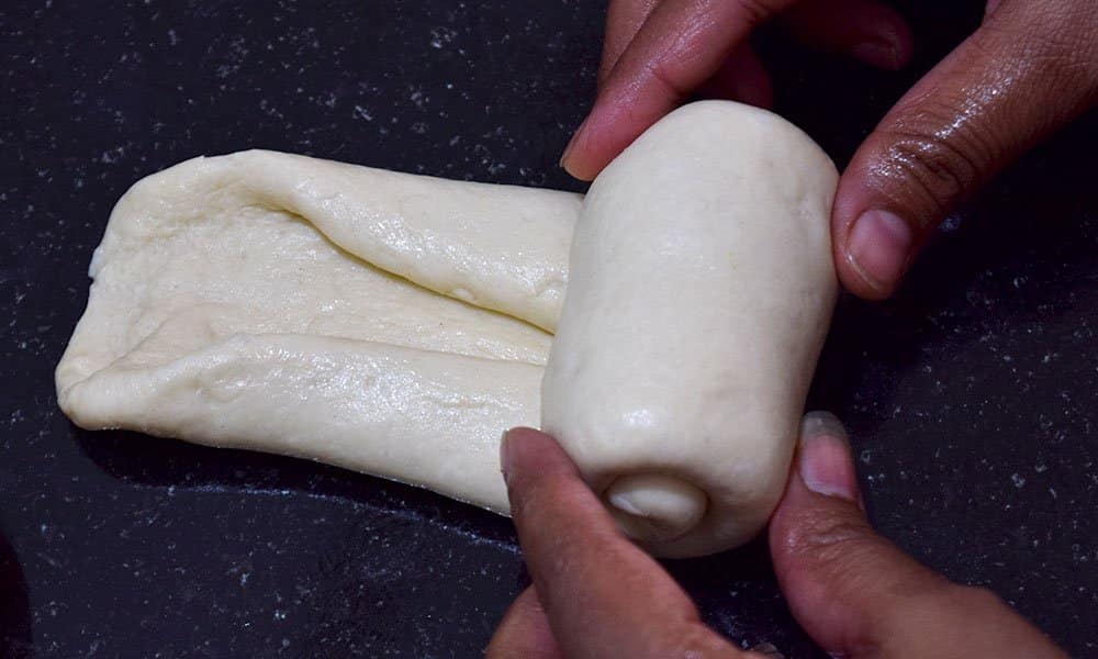 Using a rolling pin roll each portion into an oval shape sheet with ½ inch thickness. Fold the lengthwise edges towards the center and then start rolling it into a tight log (as shown in picture). Similarly, shape rest all.