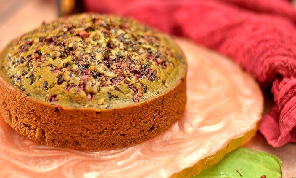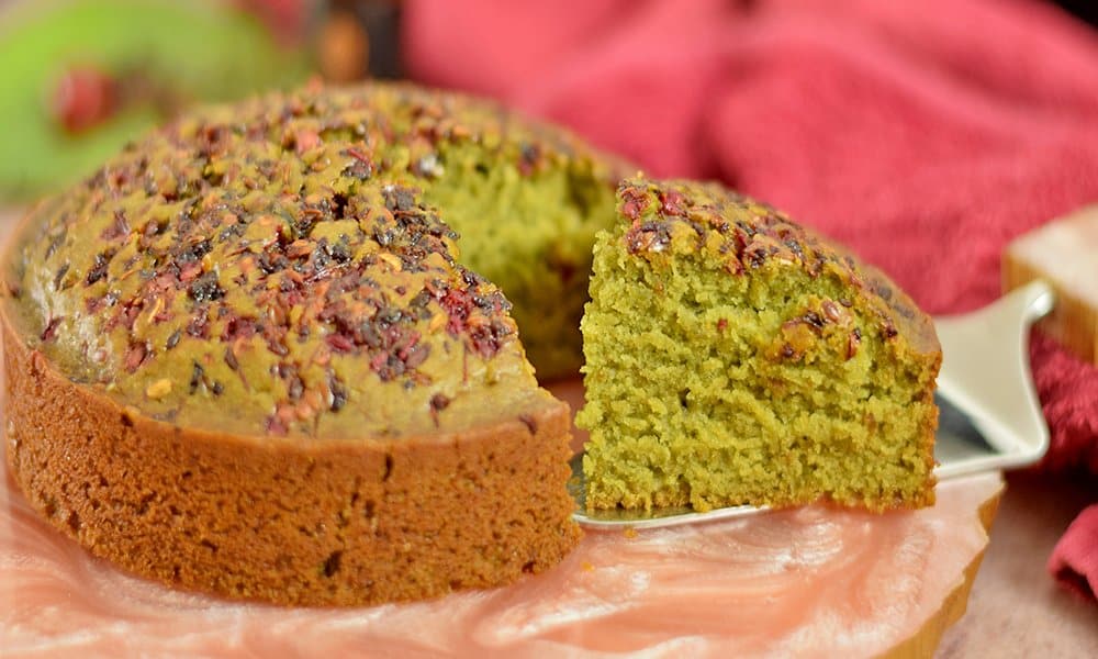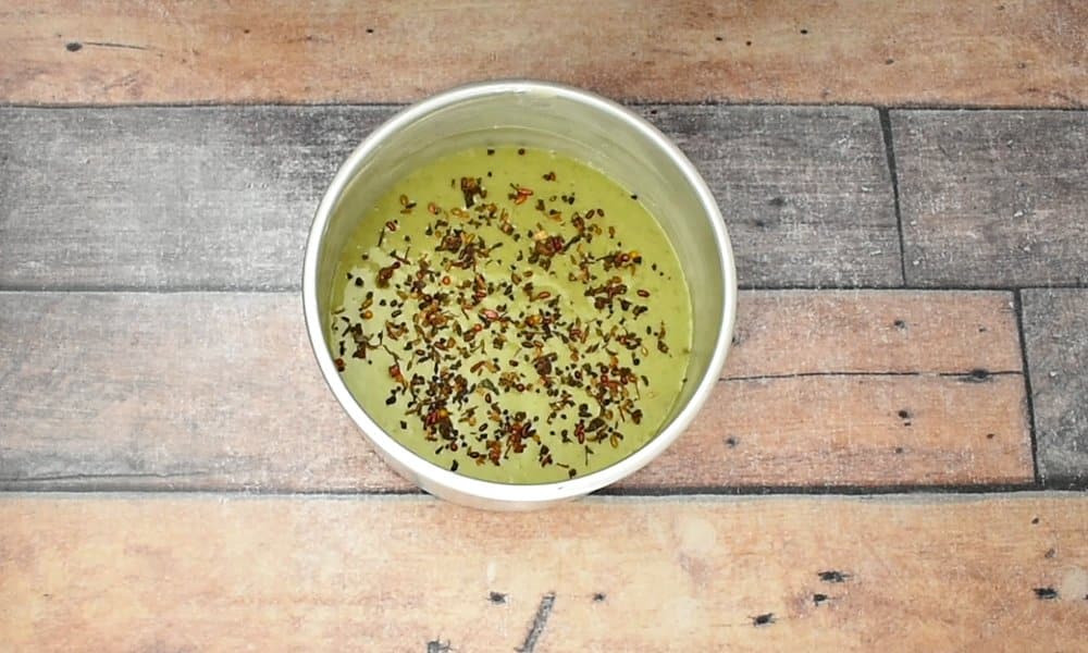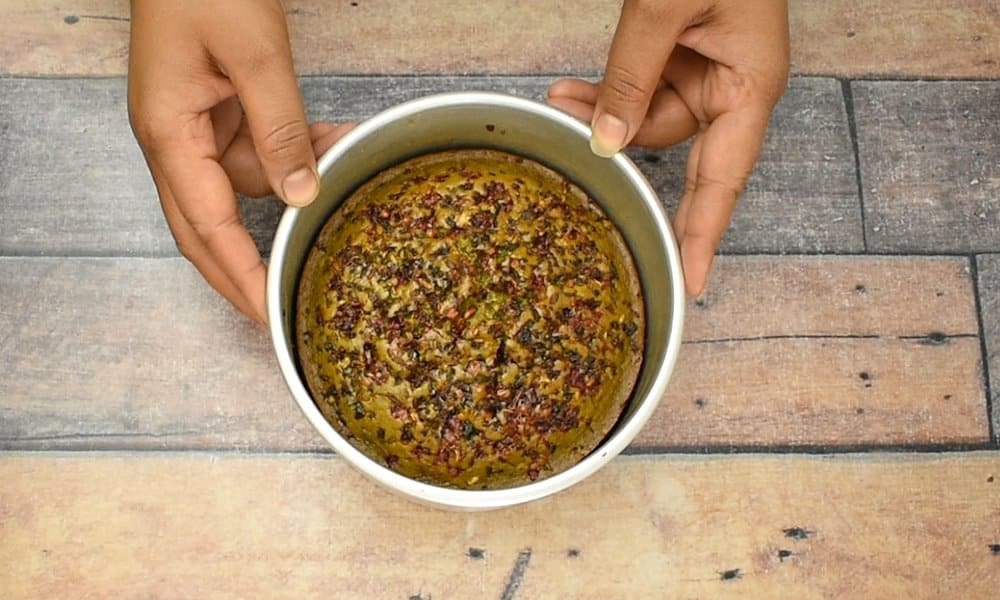 Look at the beautiful green color of the cake batter. Add 50 ml milk to the batter to adjust the consistency.The batter is ready. To bake this cake, I have used 6 inches cake tin which I have lined with parchment paper. Pour the prepared batter into the tin and tap it on the counter. To make the cake beautiful, Sprinkle some sweet supari mixture and tap it once.
