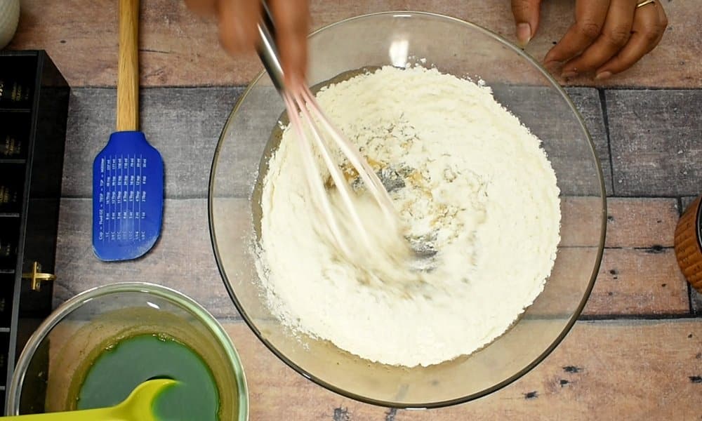 - Using a sifter, sieve flour, baking powder, baking soda and salt into wet ingredients.