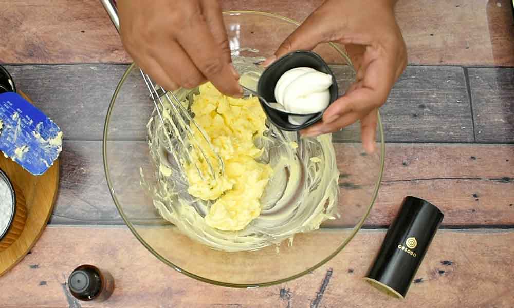 - Add 1 tbsp fresh cream to the butter. Continue to whisk until it’s light and fluffy.